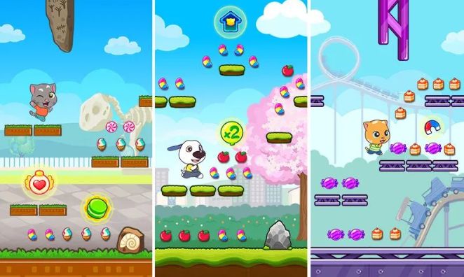 Героям предстоит побывать на самых разнообразных локациях, таких как пляжи, парки развлечений, улицы города и не только. Можно выбрать любого из понравившихся героев, чтобы проходить уровни. В любой момент можно его поменять. По дороге кроме конфет, те кто решили скачать Говорящий Том: за конфетами! На андроид, должны подбирать сундуки и монетки. Они пойдут на улучшение разных способностей питомцев. Если готовы приступить к этому безудержному веселью, то сейчас самое подходящее время.