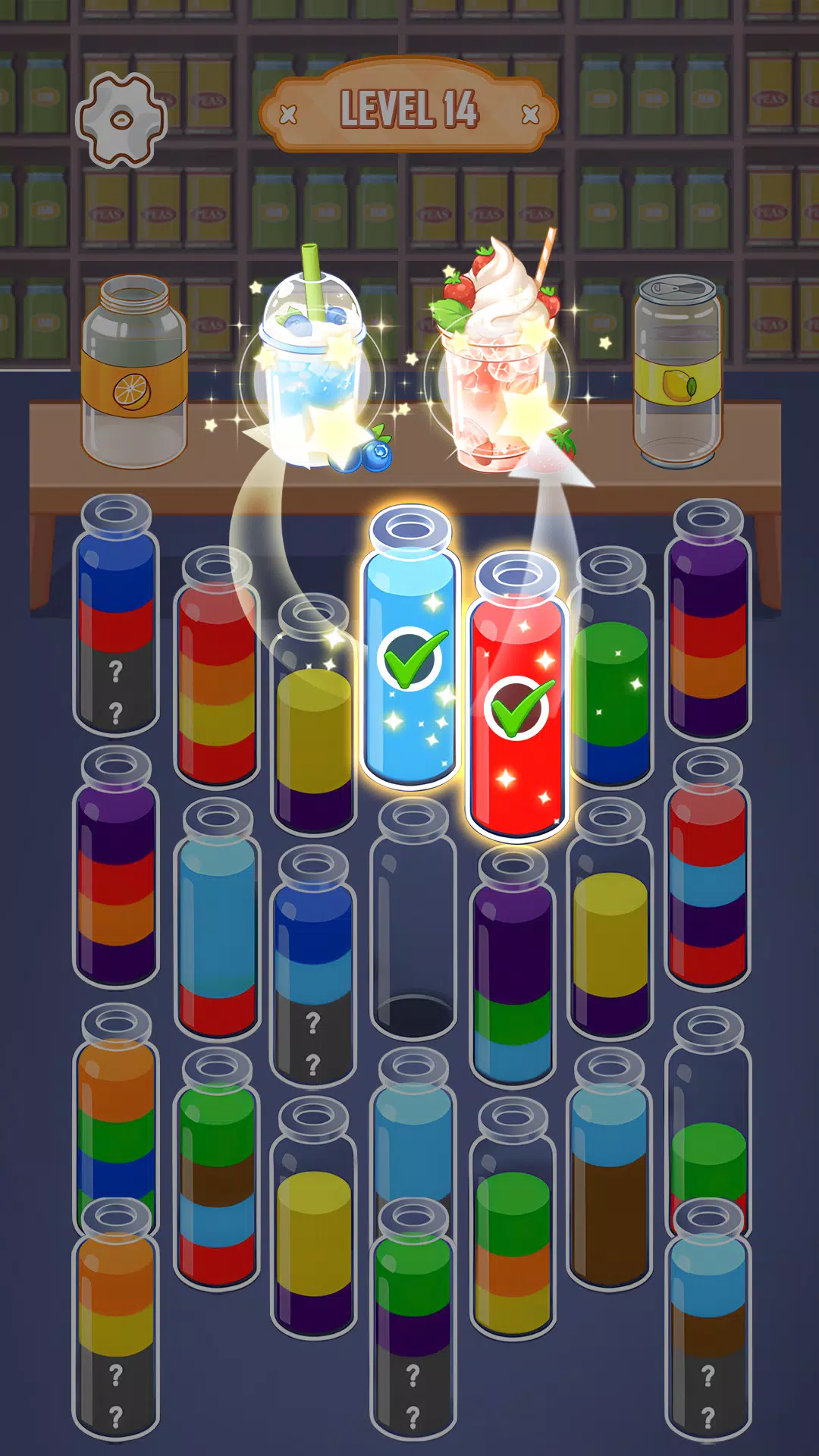- Один цвет на ёмкость: цель каждого уровня.