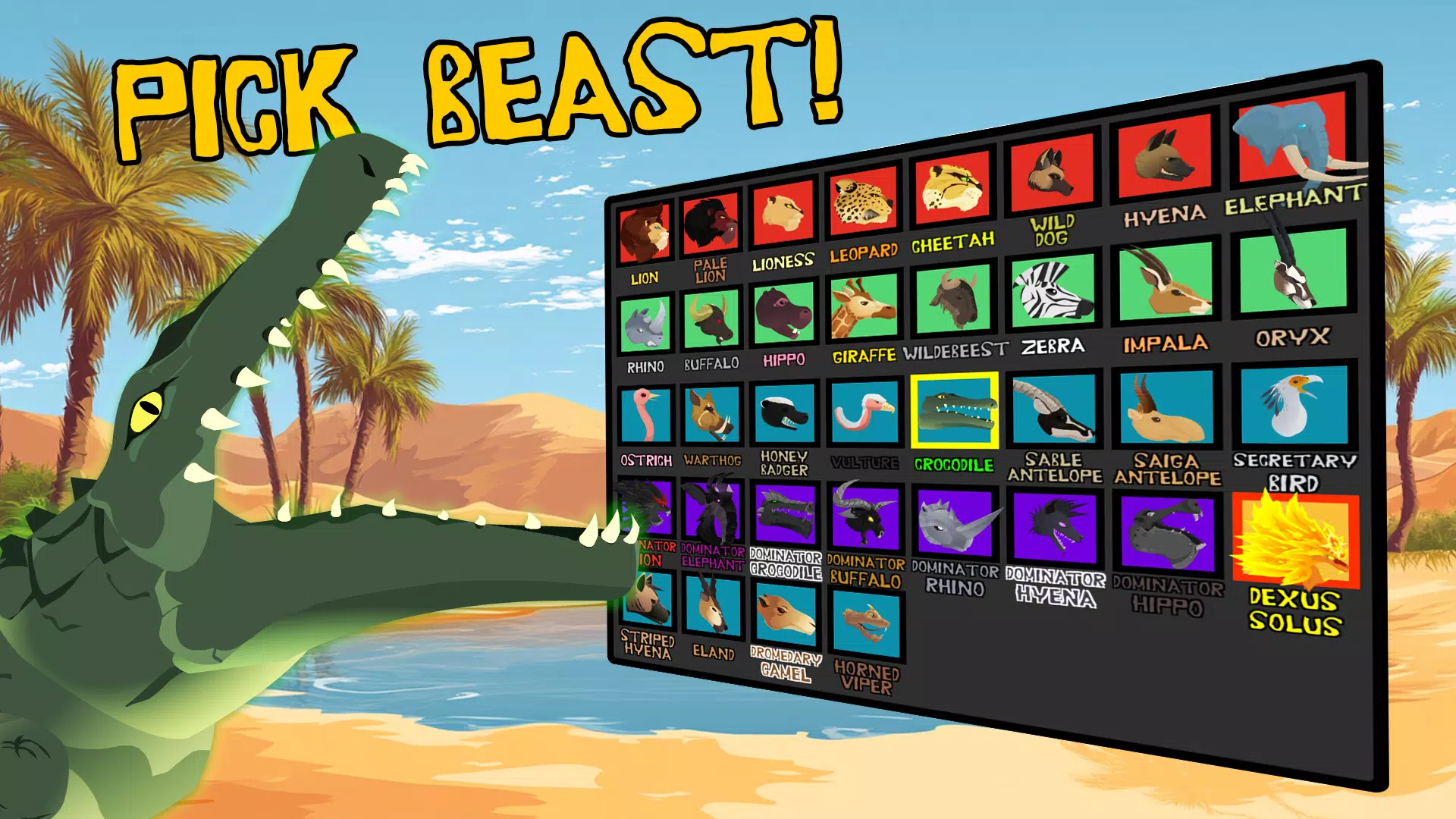 - Более 70 играбельных зверей — львы, слоны, носороги, бегемоты, буйволы, гиены, леопарды, гепарды, африканские дикие собаки. Каждое животное обладает уникальным стилем боя и набором атак.