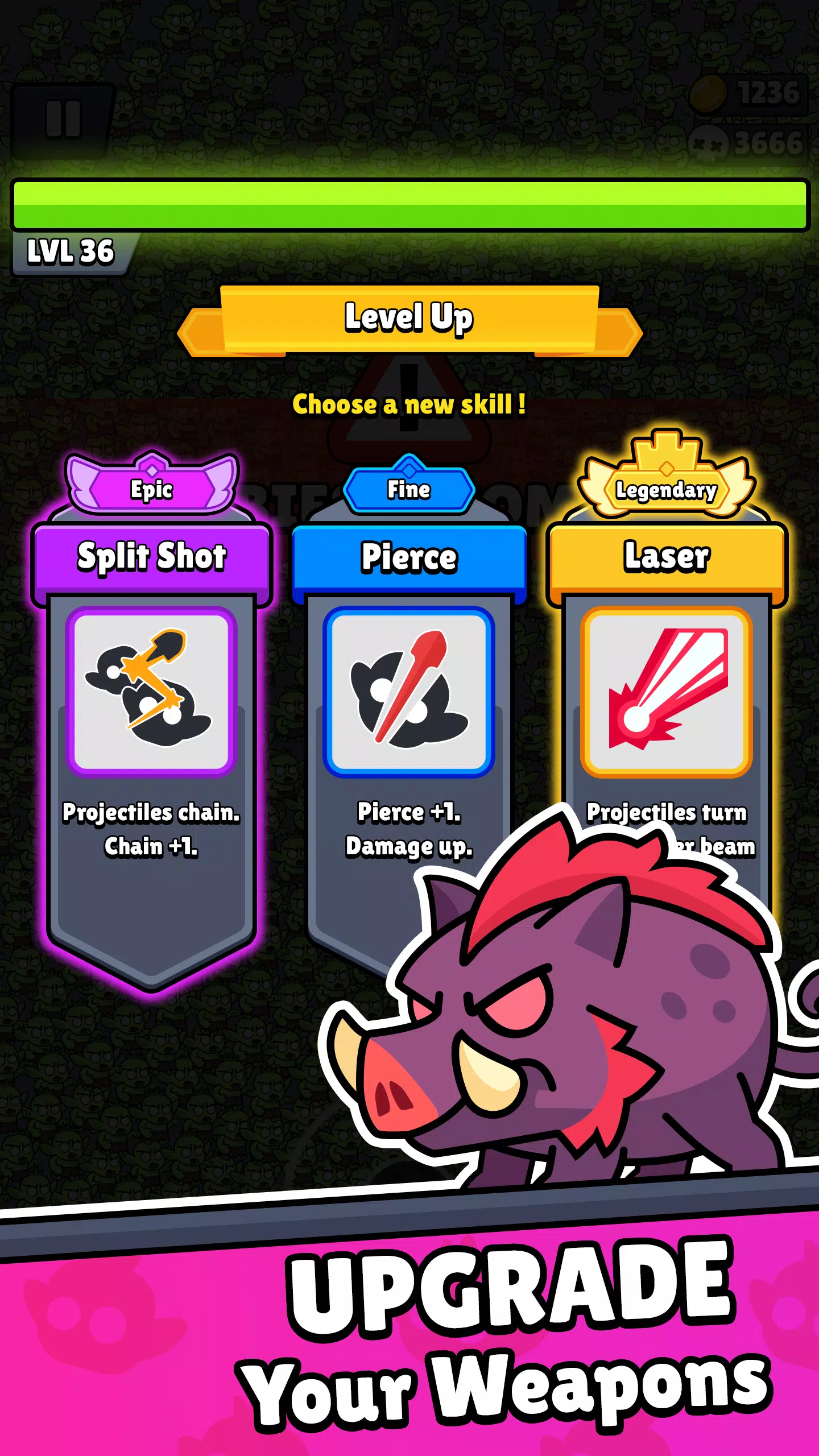 - Волновое выживание — монстры атакуют непрерывно, и с каждой волной их становится больше. Ваша задача — продержаться, набирая силу быстрее, чем растёт угроза.