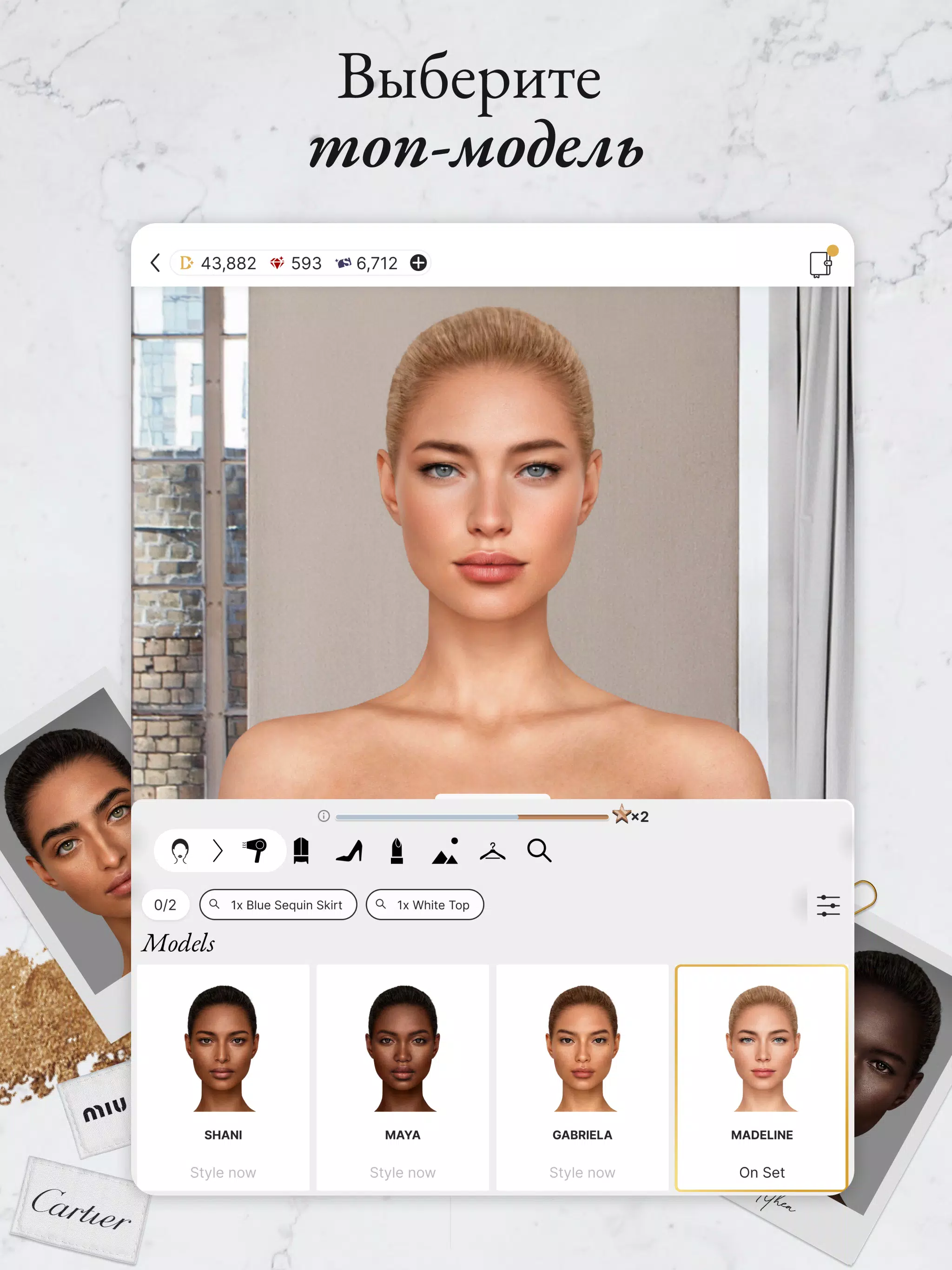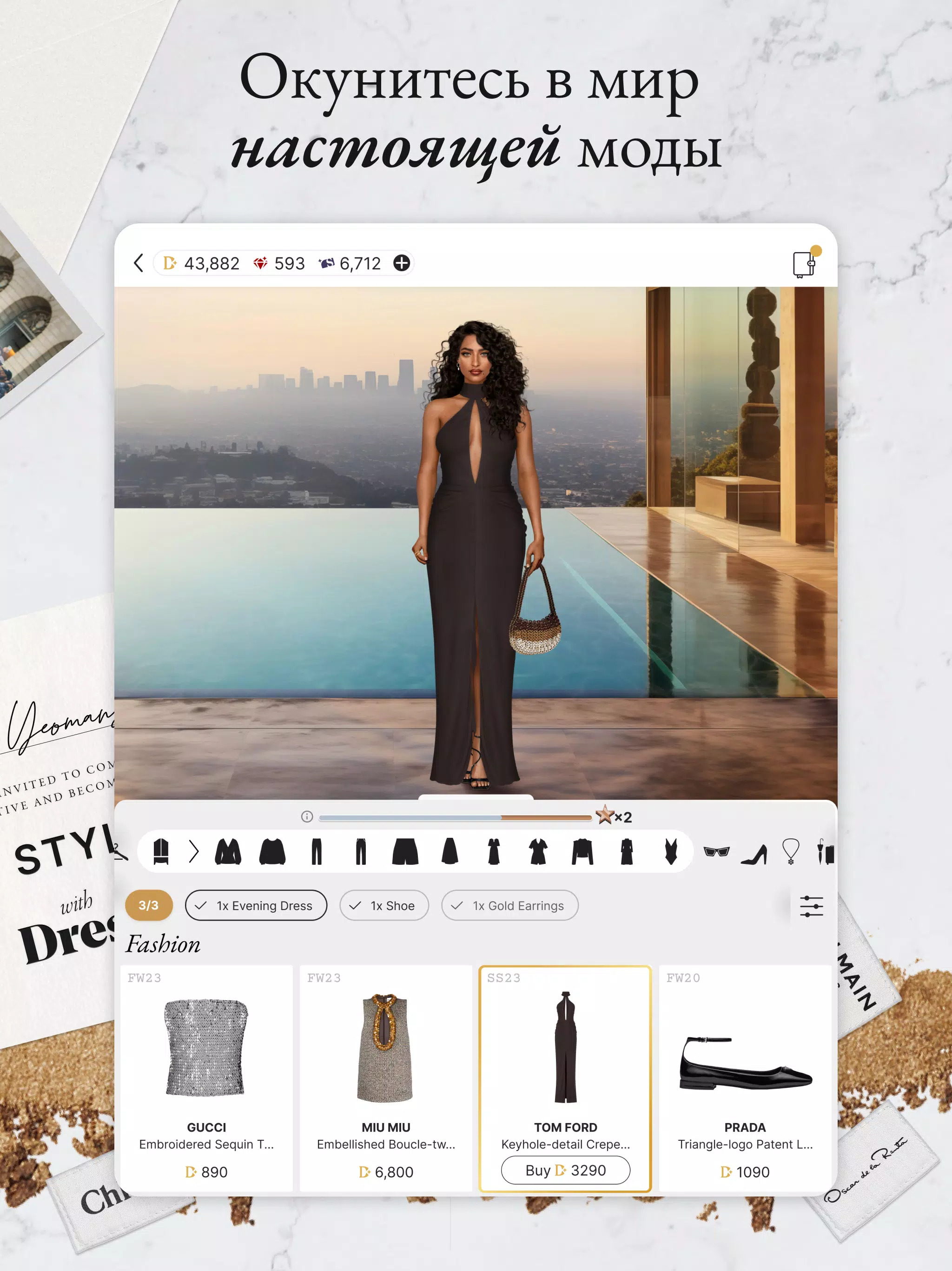 - Реальные бренды и коллекции — работайте с одеждой и аксессуарами от топовых дизайнеров. Никаких выдуманных марок — только настоящая мода, которую можно увидеть на подиумах и в бутиках.