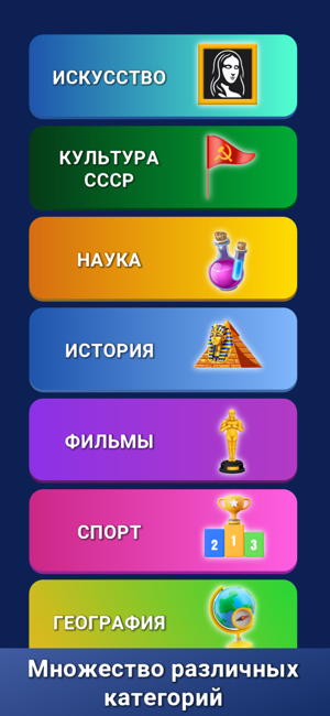 Если вас не пугают такие вызовы, то пора принять условия и продемонстрировать всю силу своего интеллекта. Множество вопросов на разные категории, такие как наука, спорт, кино, искусство и не только. Если скачать Знания Сила : Викторина на андроид можно будет окунуться в мир знаний, познать много нового и расширить собственный кругозор.