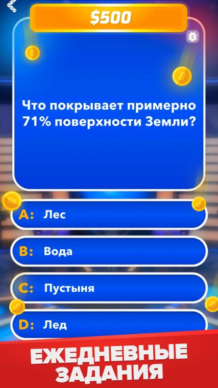 Сама игра покорит ваши сердца, ведь у неё очень удобный и привлекательный интерфейс. Добавлены тысячи вопросов, которые не будут повторять во время прохождения викторины. Звуки и атмосфера помогут легко проникнуться ею. Скачать Миллионер: Викторина на андроид могут как взрослые, так и дети. На первых уровней будет легко, но дальше сложность нарастает. Воспользуйтесь подсказками, когда совсем будет трудно.