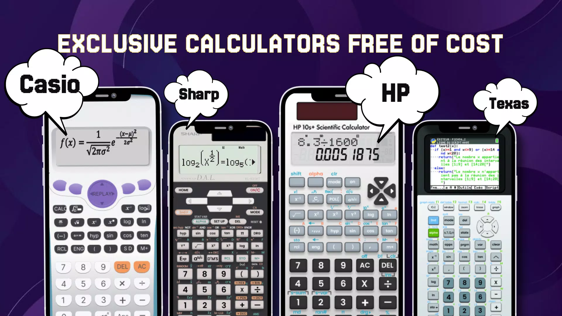Это приложение объединяет лучшие модели научных калькуляторов от ведущих брендов: Casio, Texas Instruments, Hewlett-Packard и Sharp. Реалистичные интерфейсы и мощные вычислительные возможности сделают решение сложных задач простым и удобным.